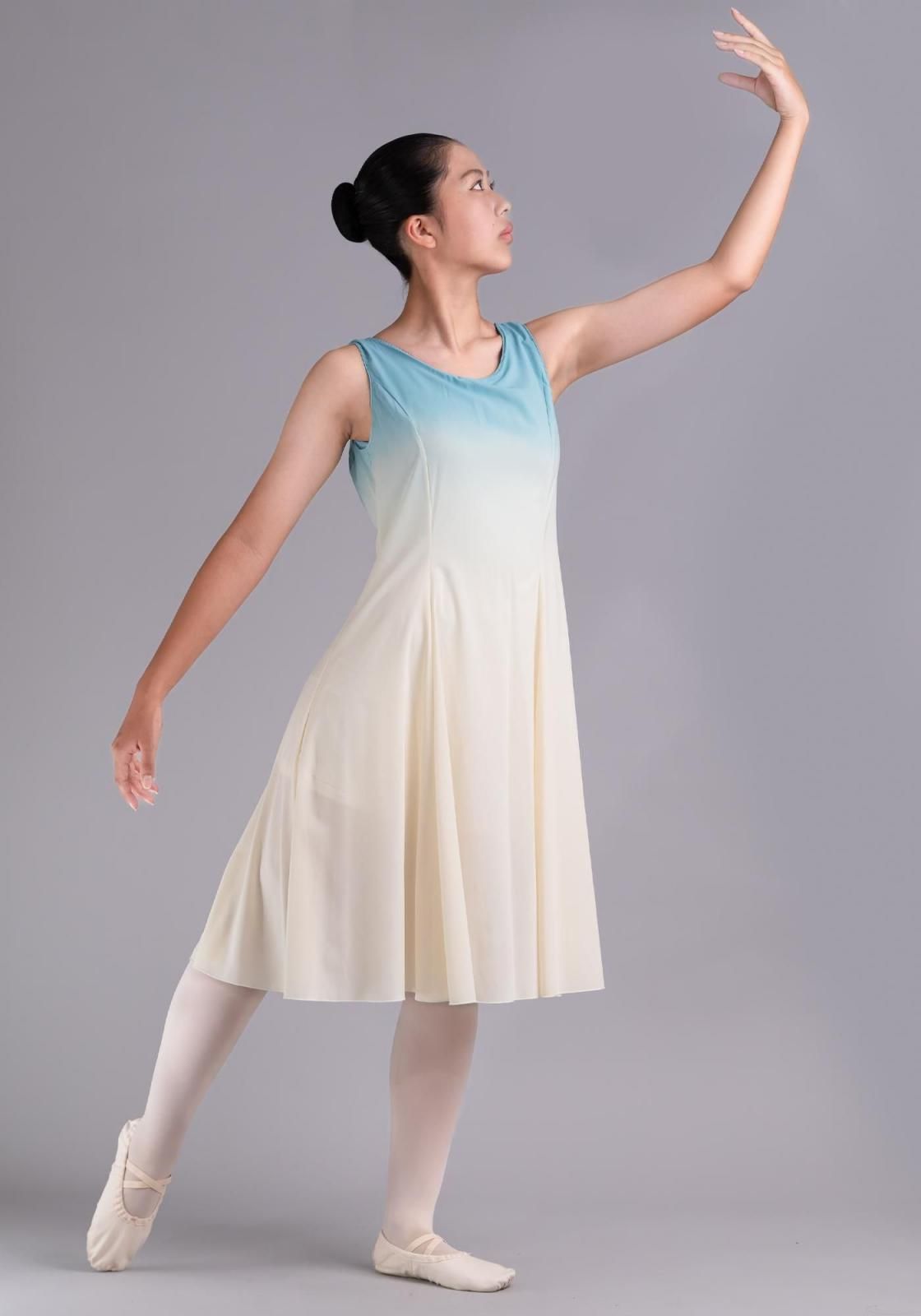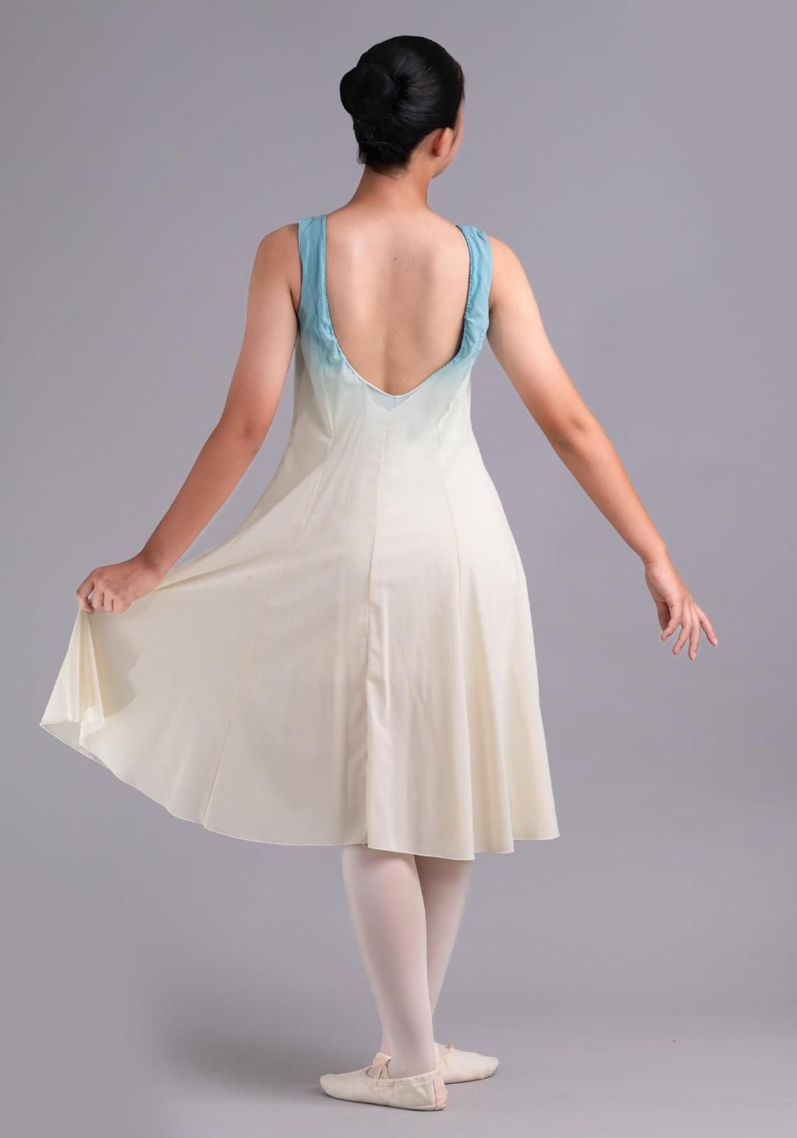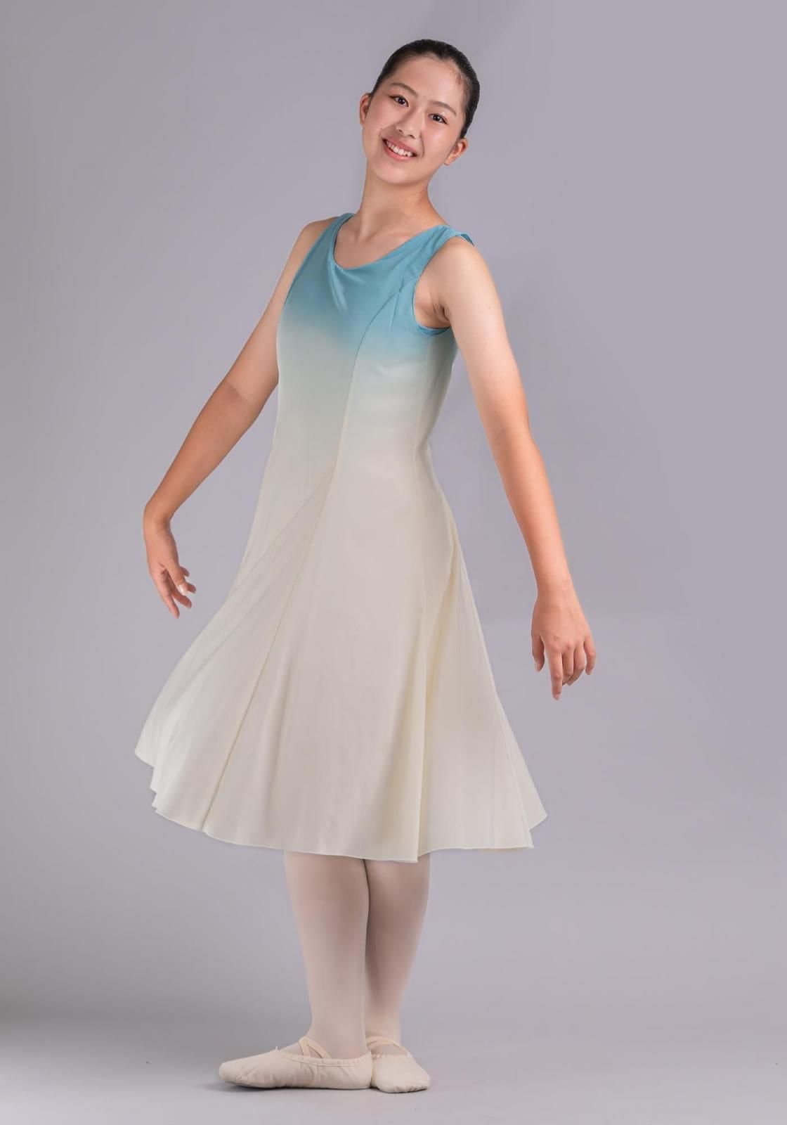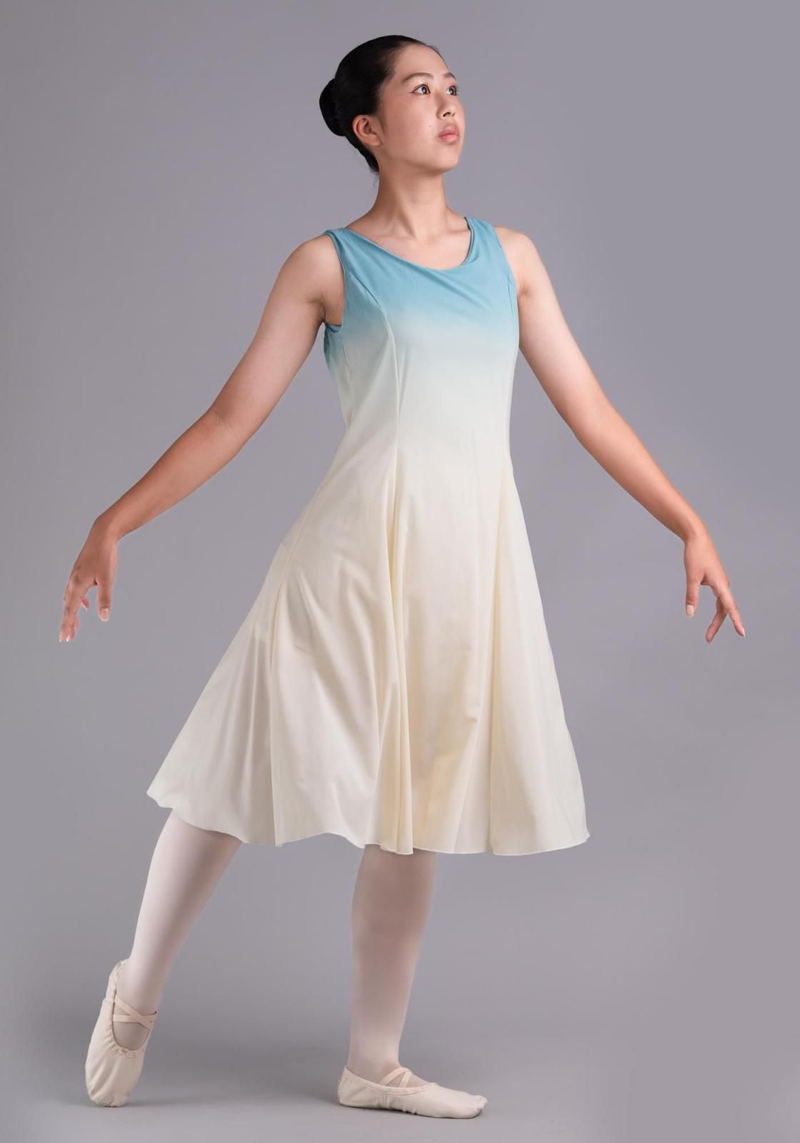 ワンピース・ユニタード共に、胸元にグラデーションの染めが入っています。