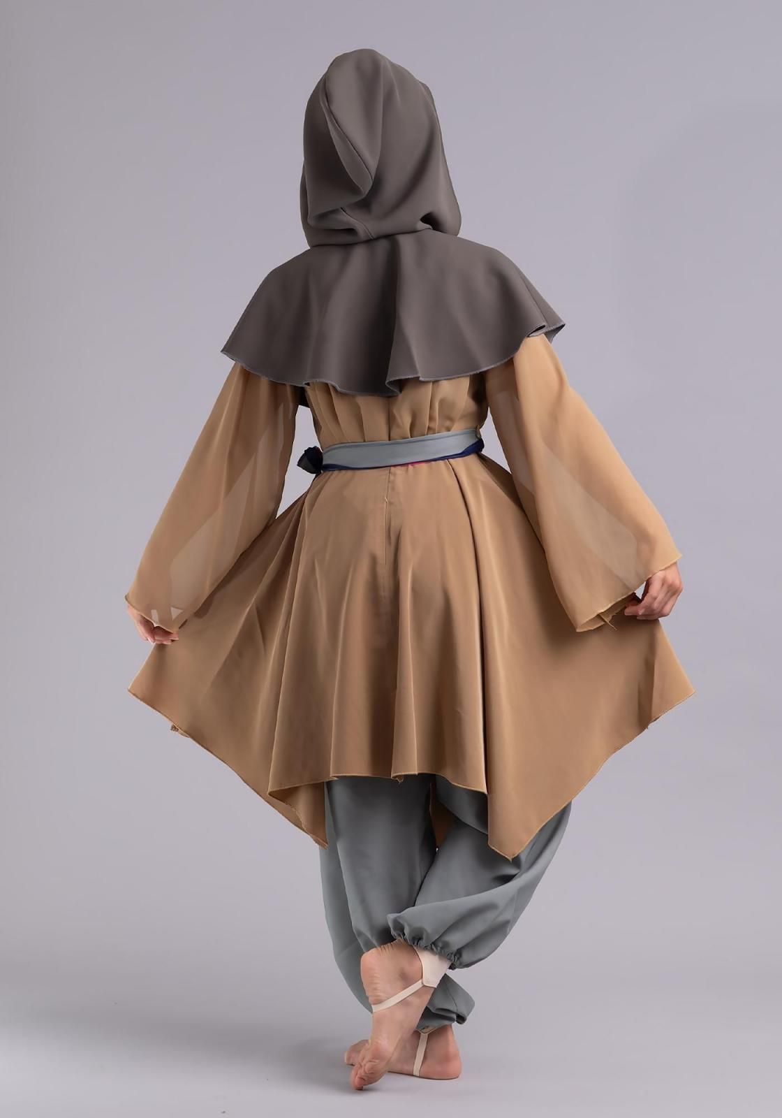 ベージュのワンピース、ゴムパンツ、頭巾のセットです。