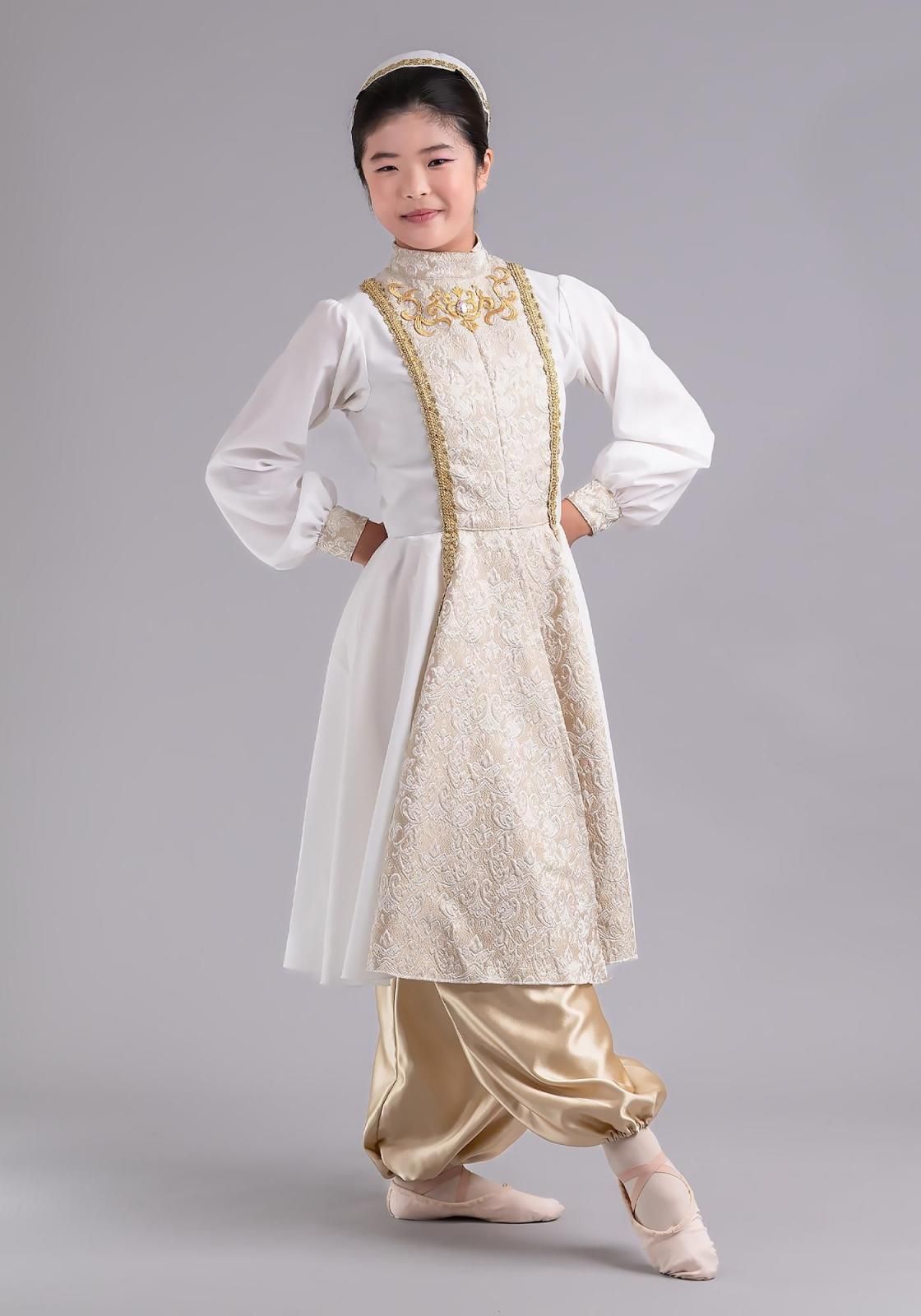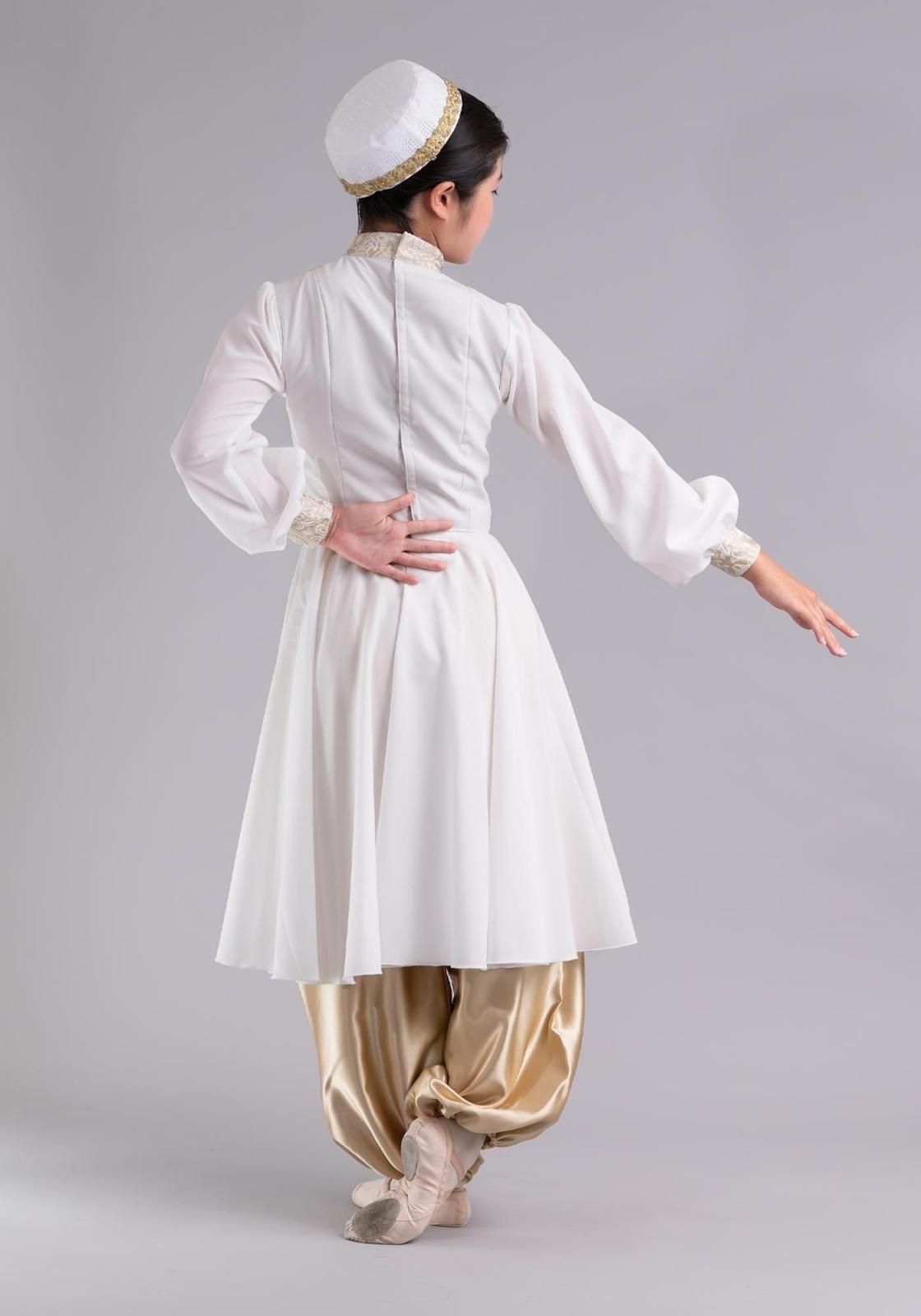 白のワンピース、ゴールドのパンツ、帽子のセットです。