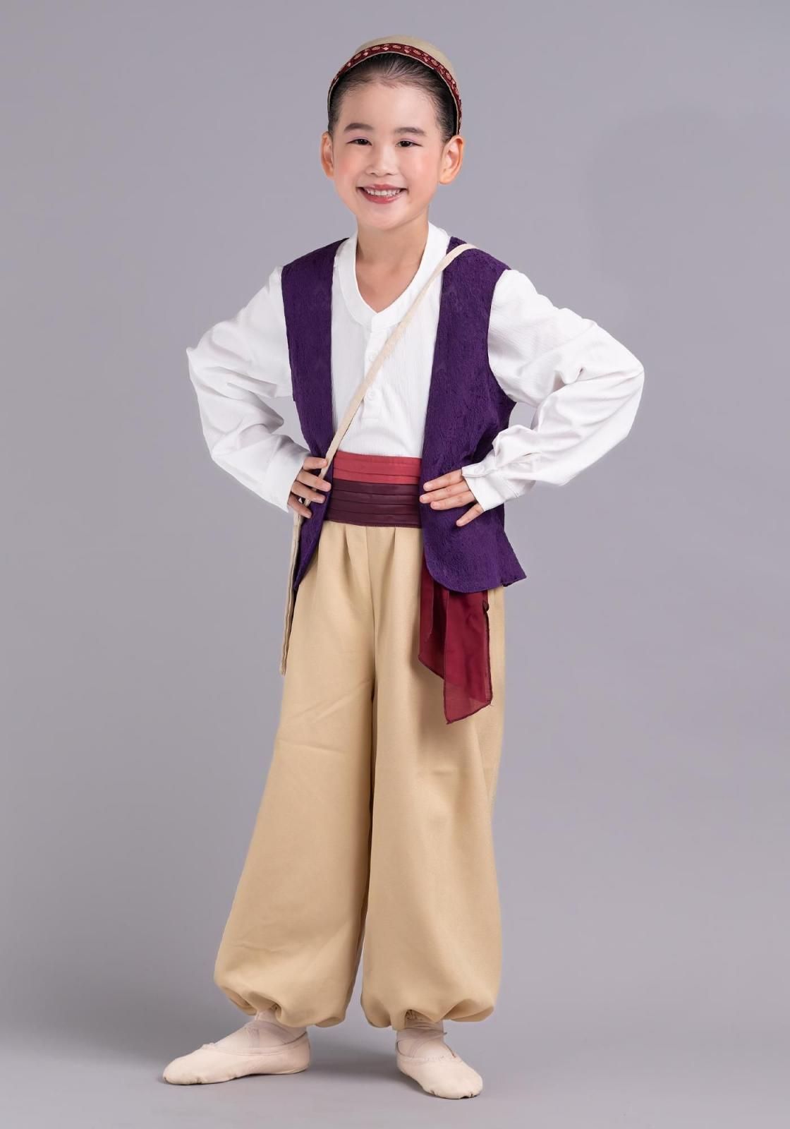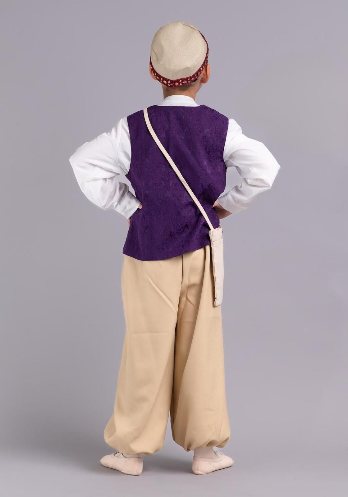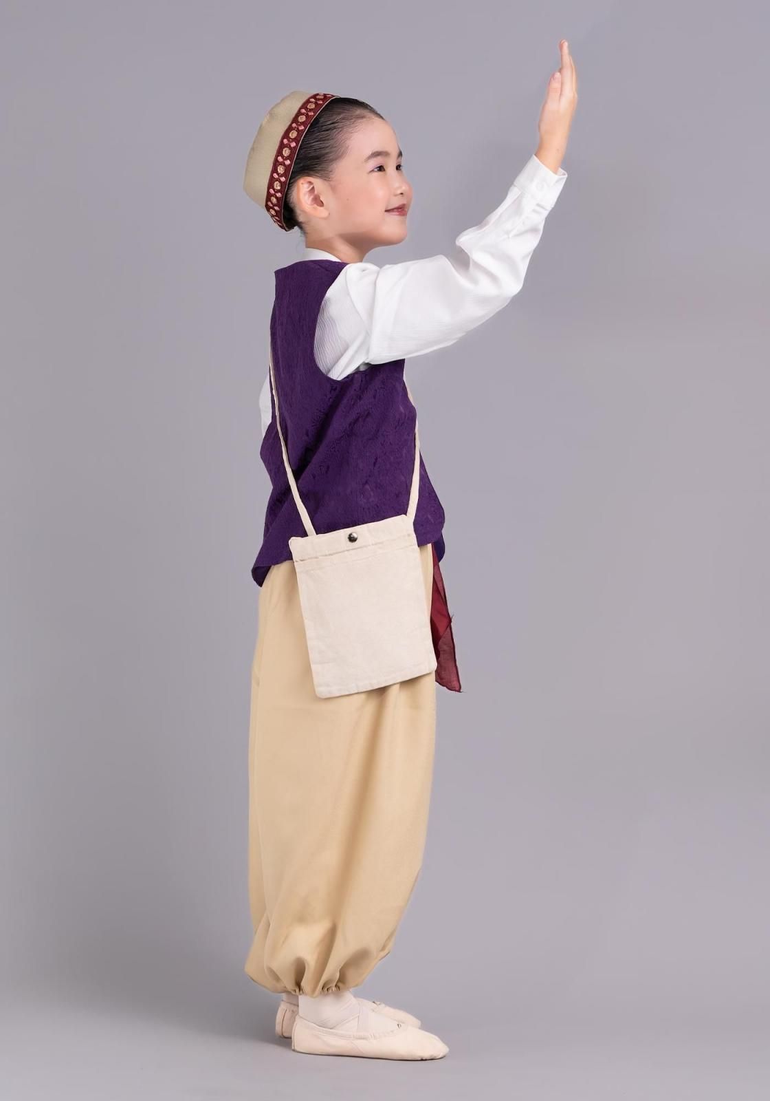 白いシャツ、パンツ、紫のベスト、帽子のセットです。