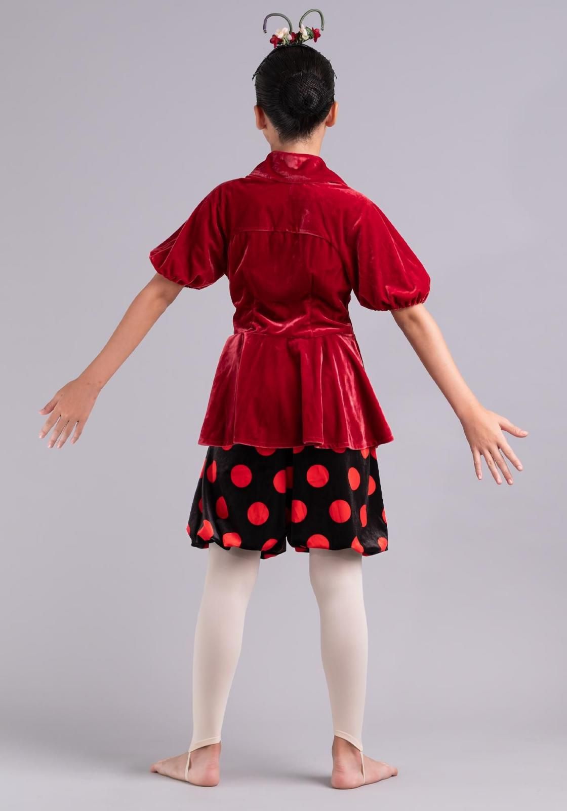 ジュニアMサイズのレッドのトップスと、ジュニアLサイズのパンツを着用